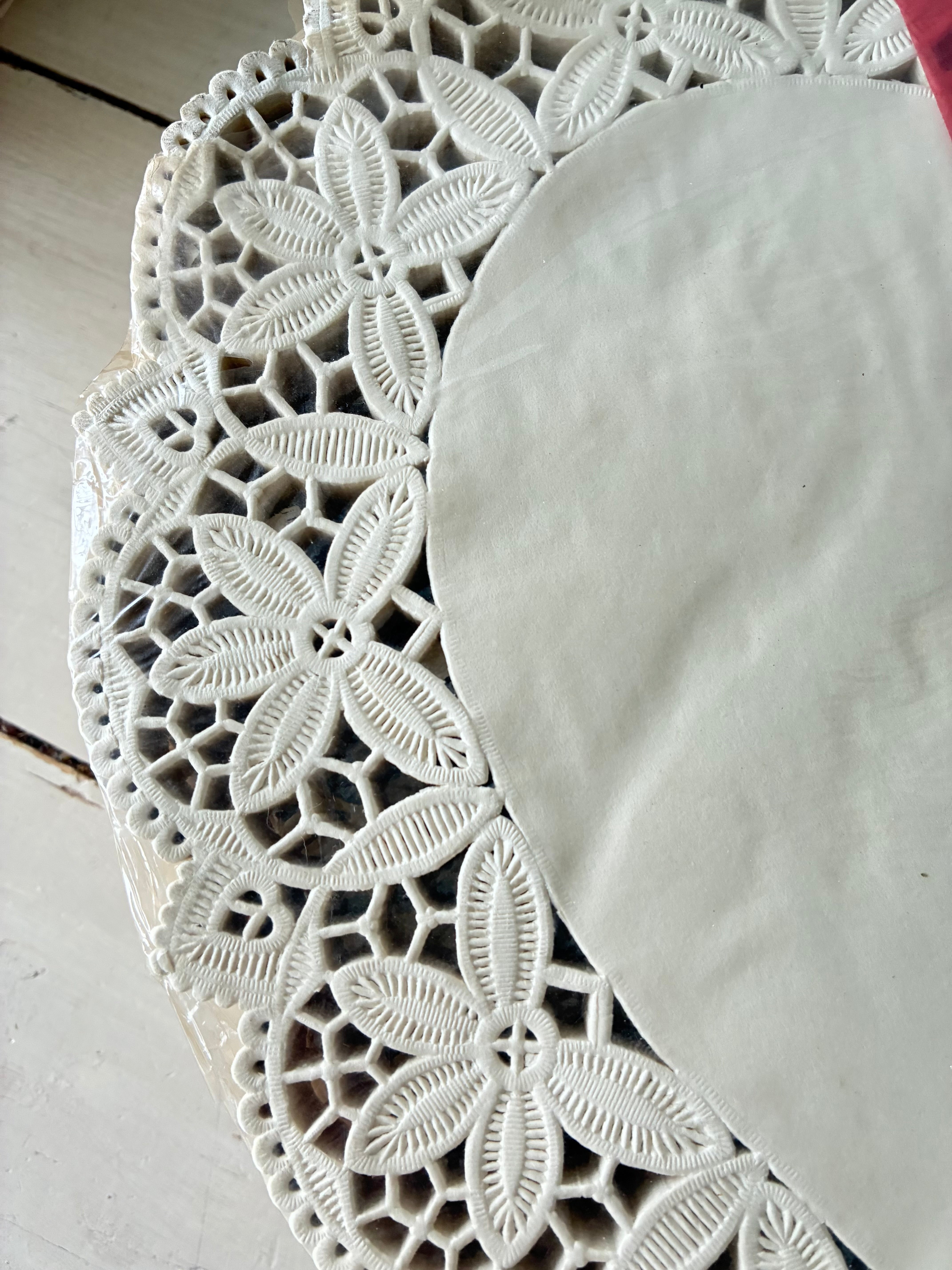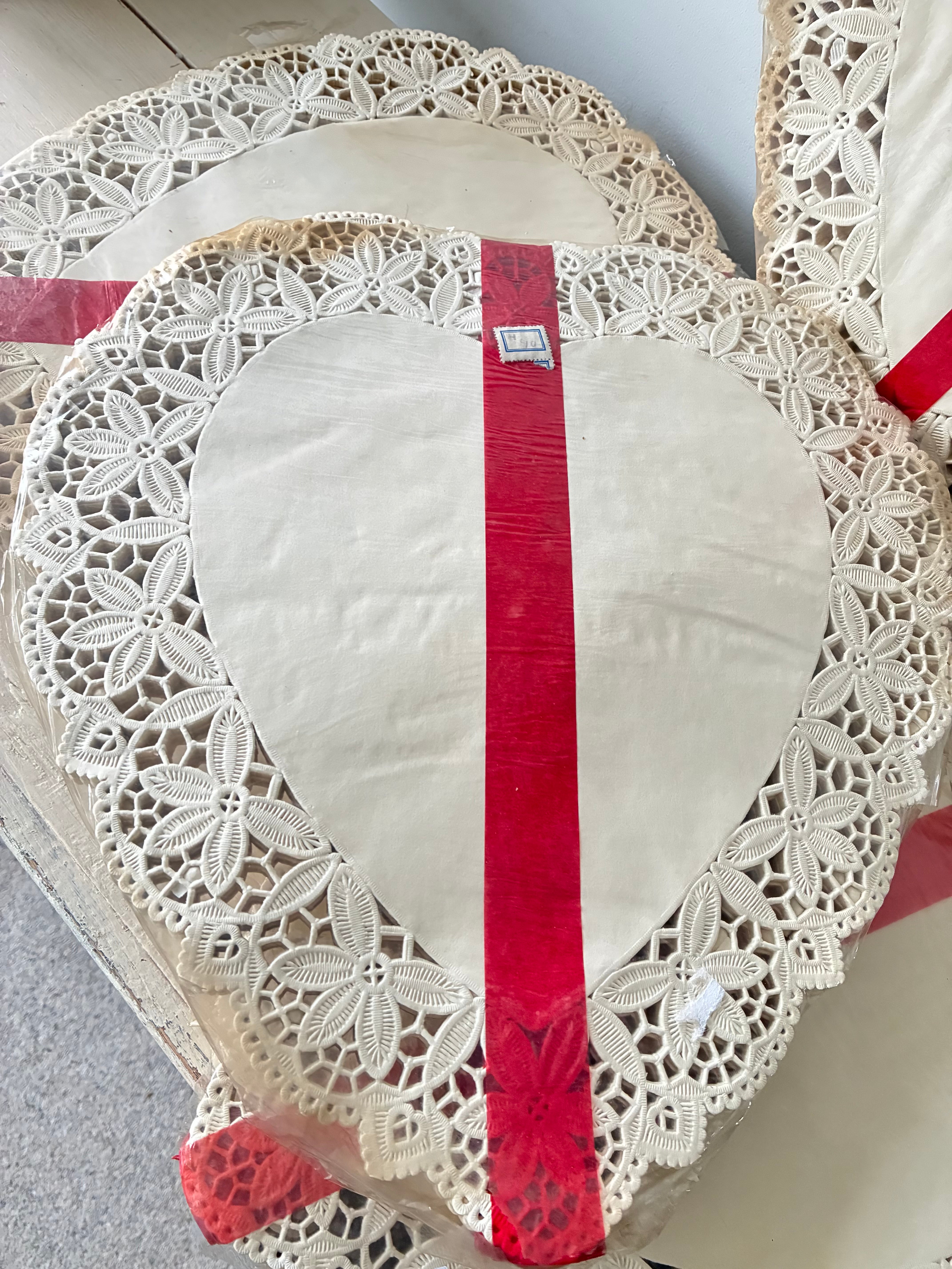 I absolutely love these.. dead stock packs of heart shaped doilies from a bakery in Belgium . I think they probably date from the ‘60’’s . They would be great for crafting, shop decoration .. or imagine them at a wedding!! The packs are all sealed so I’m not sure exactly how many are in each but from a rough count it’s around 50 .