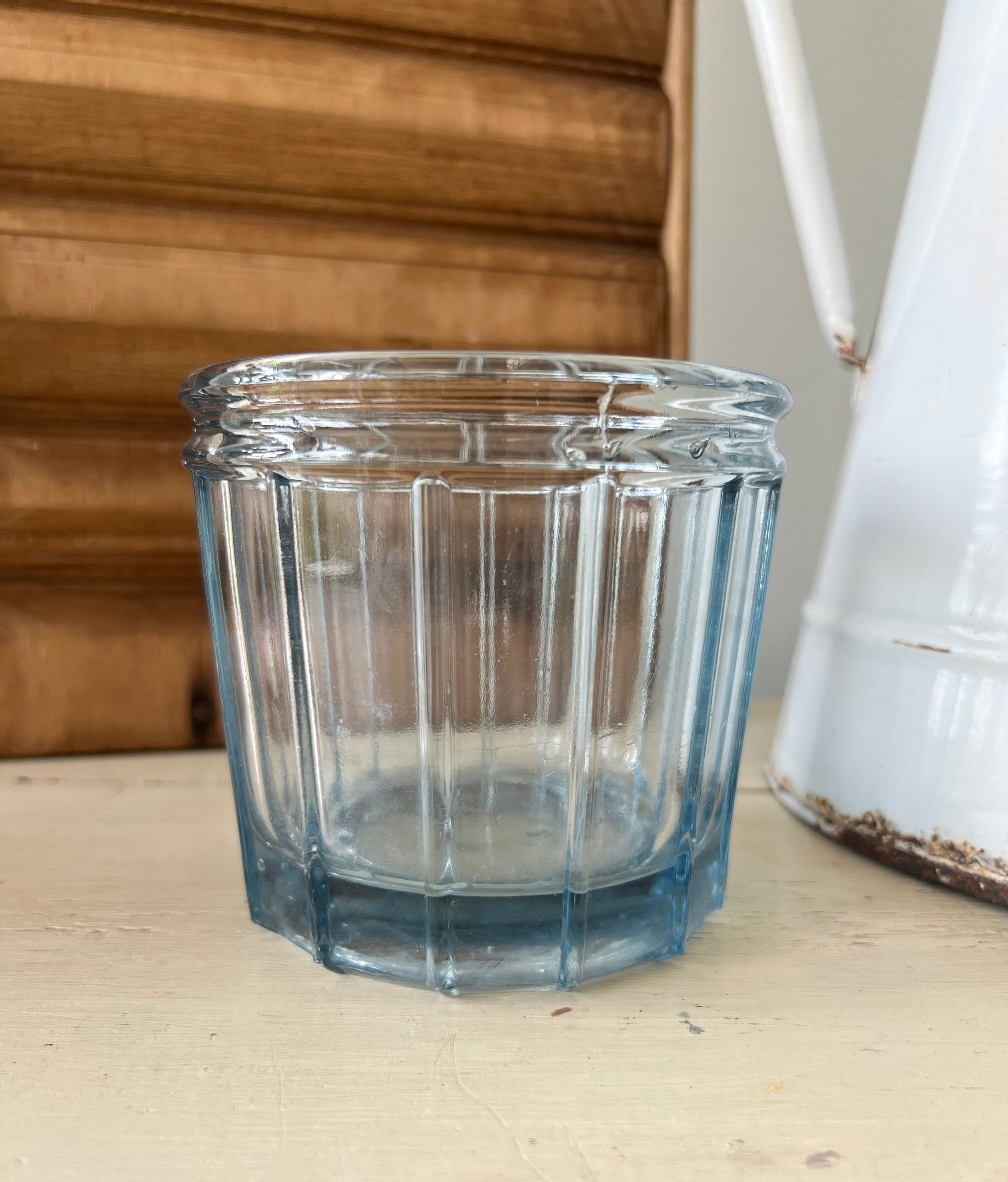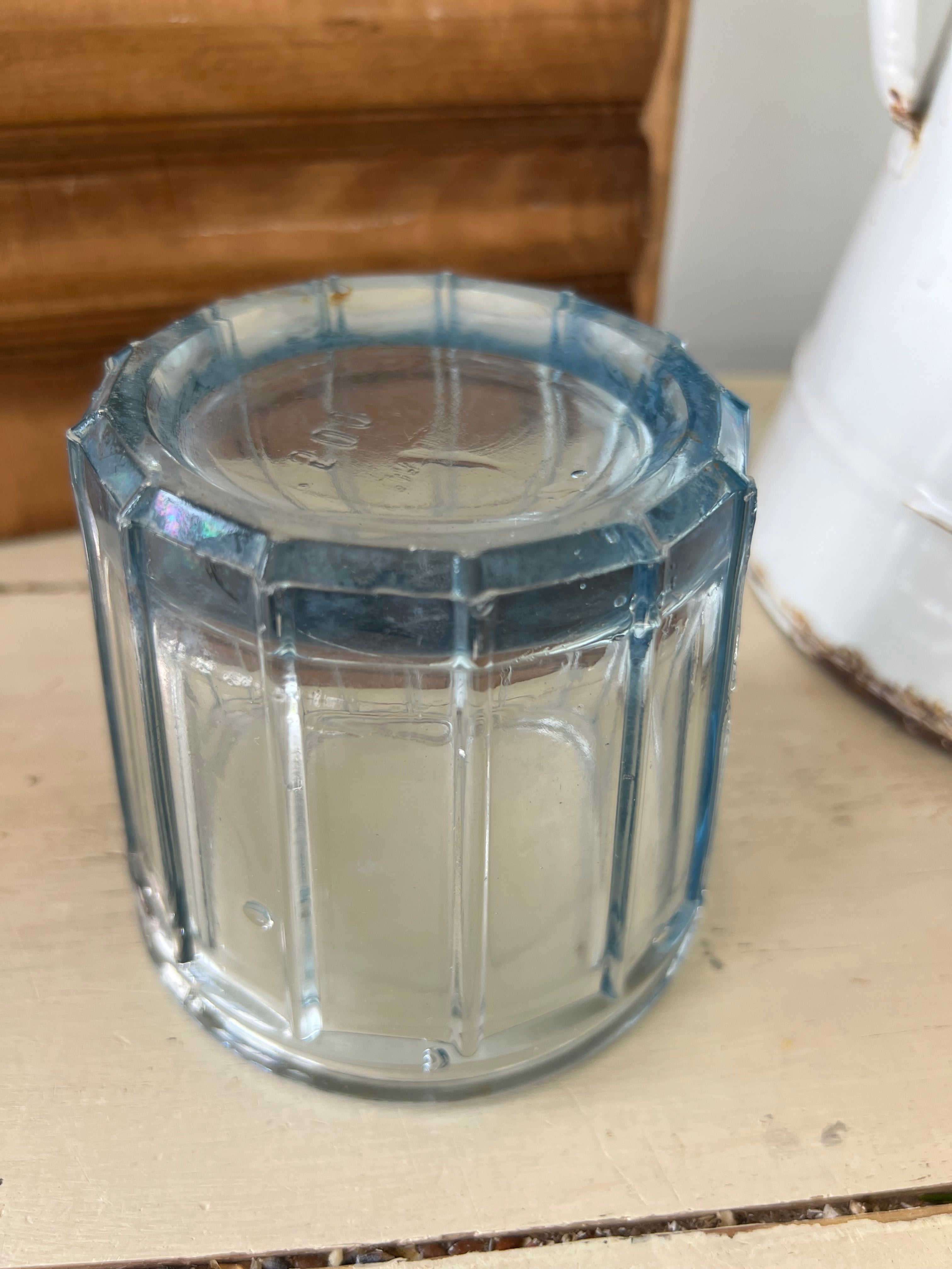 I remember finding my first glass confiture jar in France and being really happy.. fast forward about 30 years and I’m still buying them but have never had a blue one . This is really unusual and a lovely heavy one. It looks great with a candle flickering inside or a bunch of garden blooms .