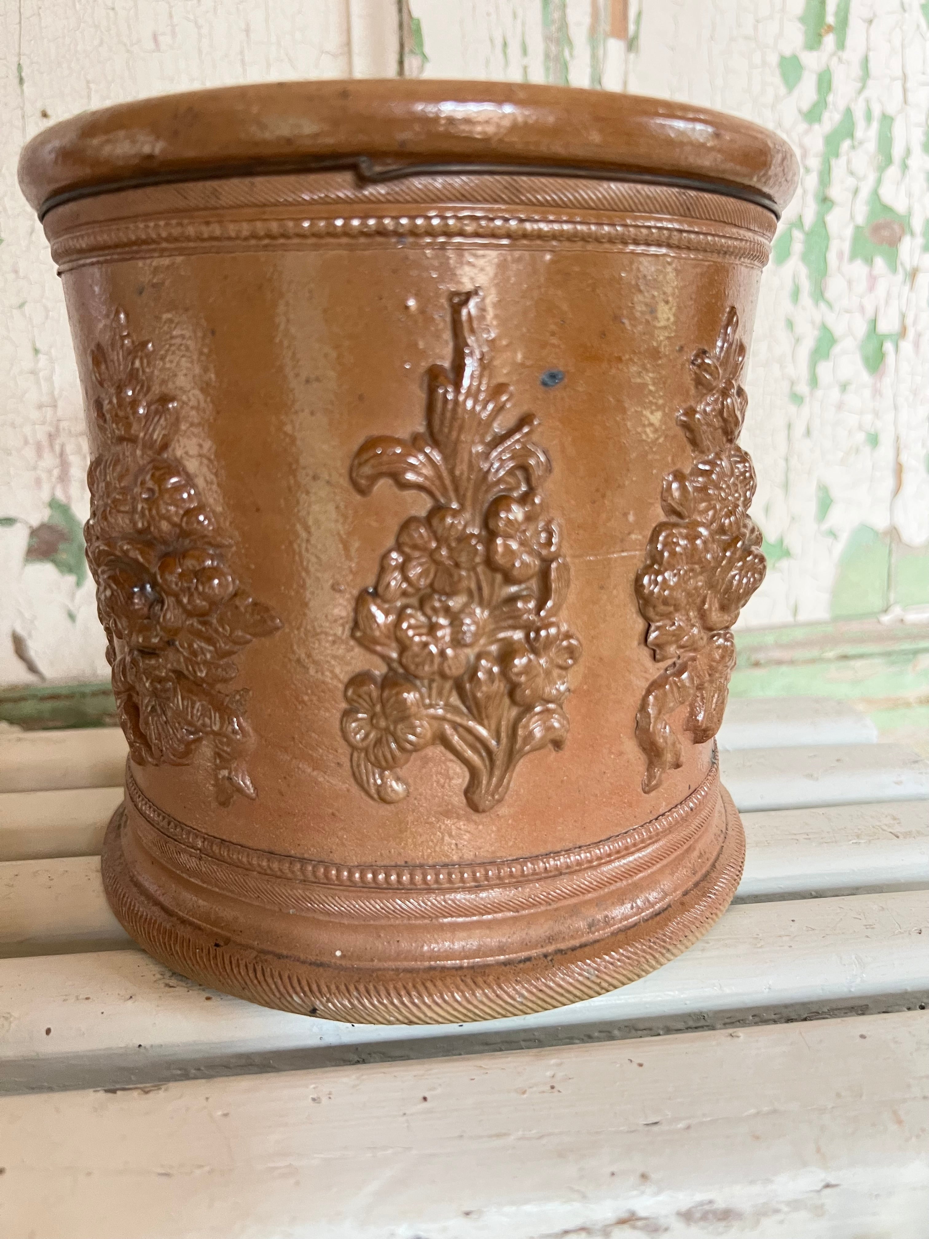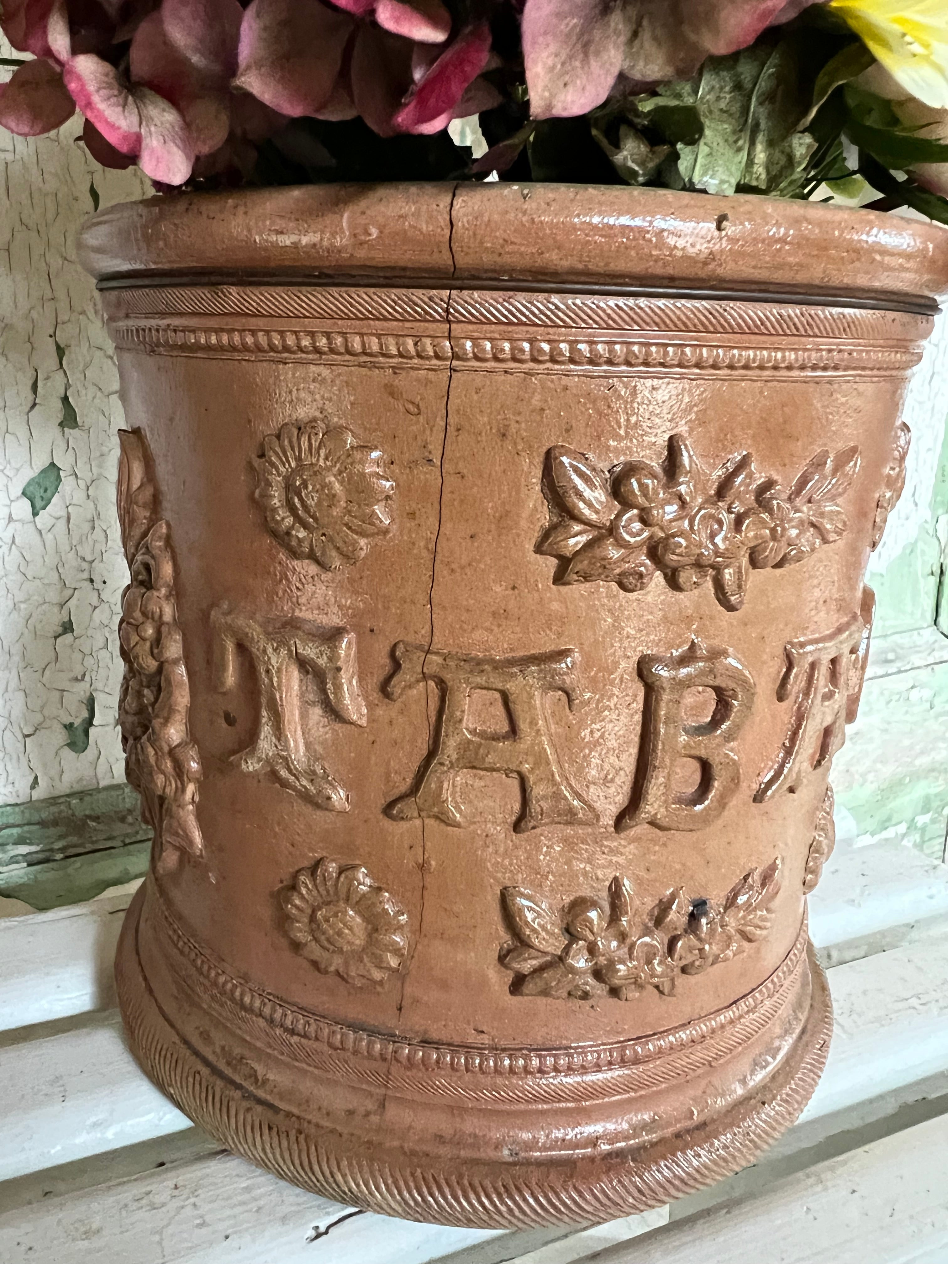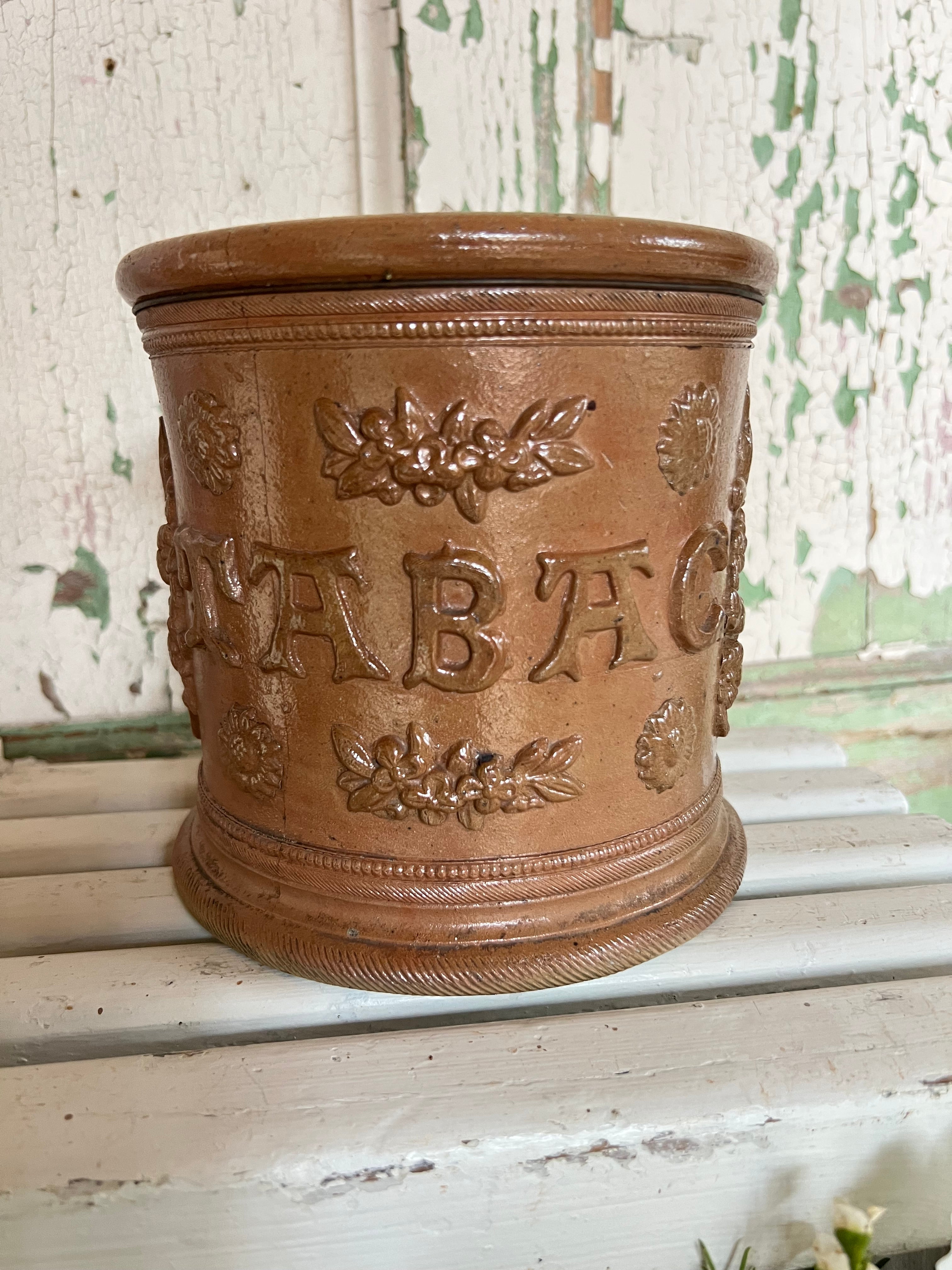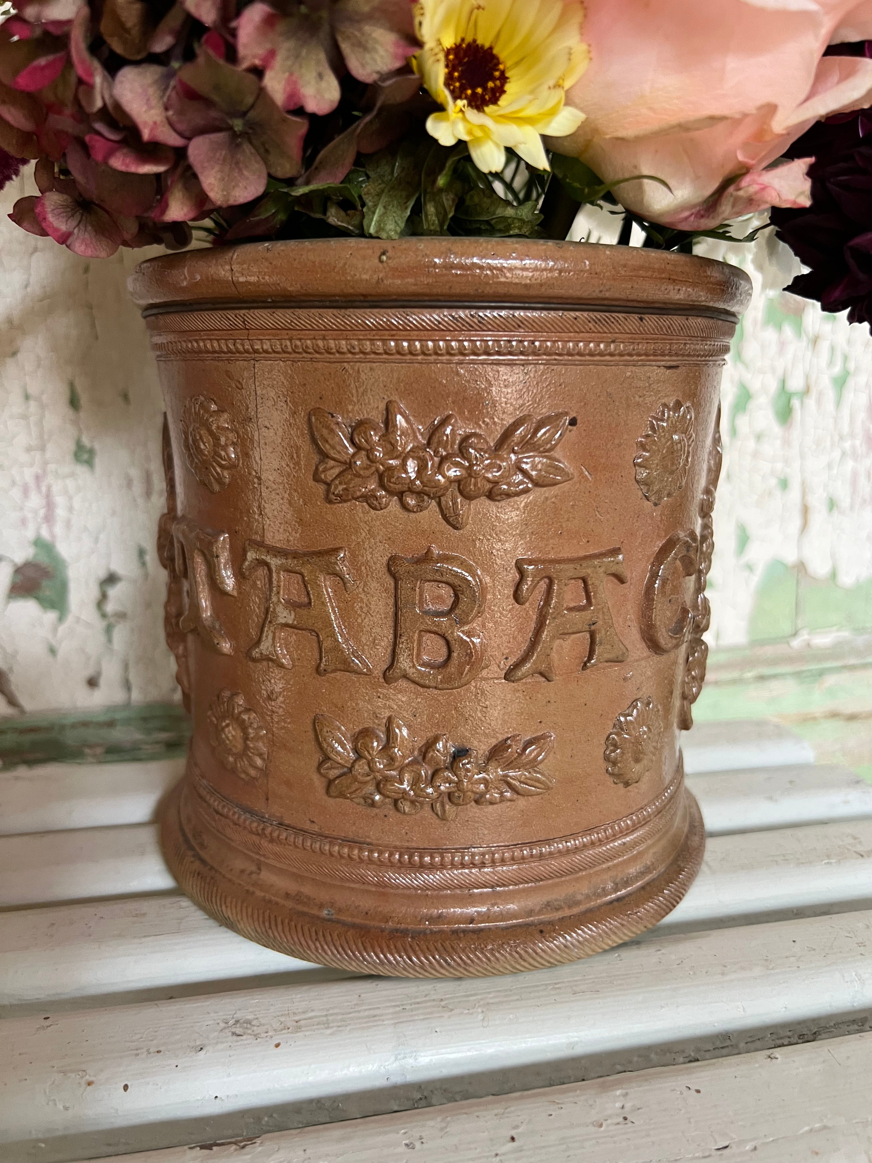 This would have originally been in a French Tabac full of loose tobacco , but now it’s the perfect pot for some flowers ( fresh or dried) or a great spot for a plant . The colour is just gorgeous especially with Autumn tones and the raised writing and decoration are just fabulous. There is a hairline as shown but it’s stable and this is reflected in the price .