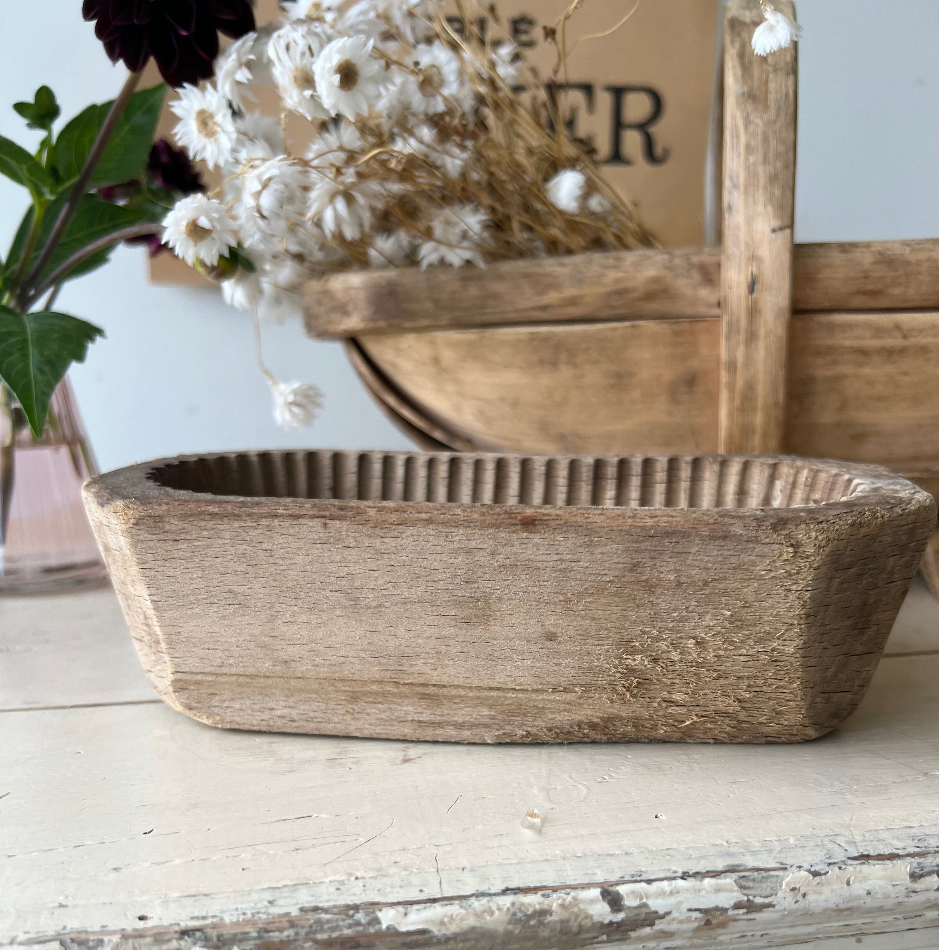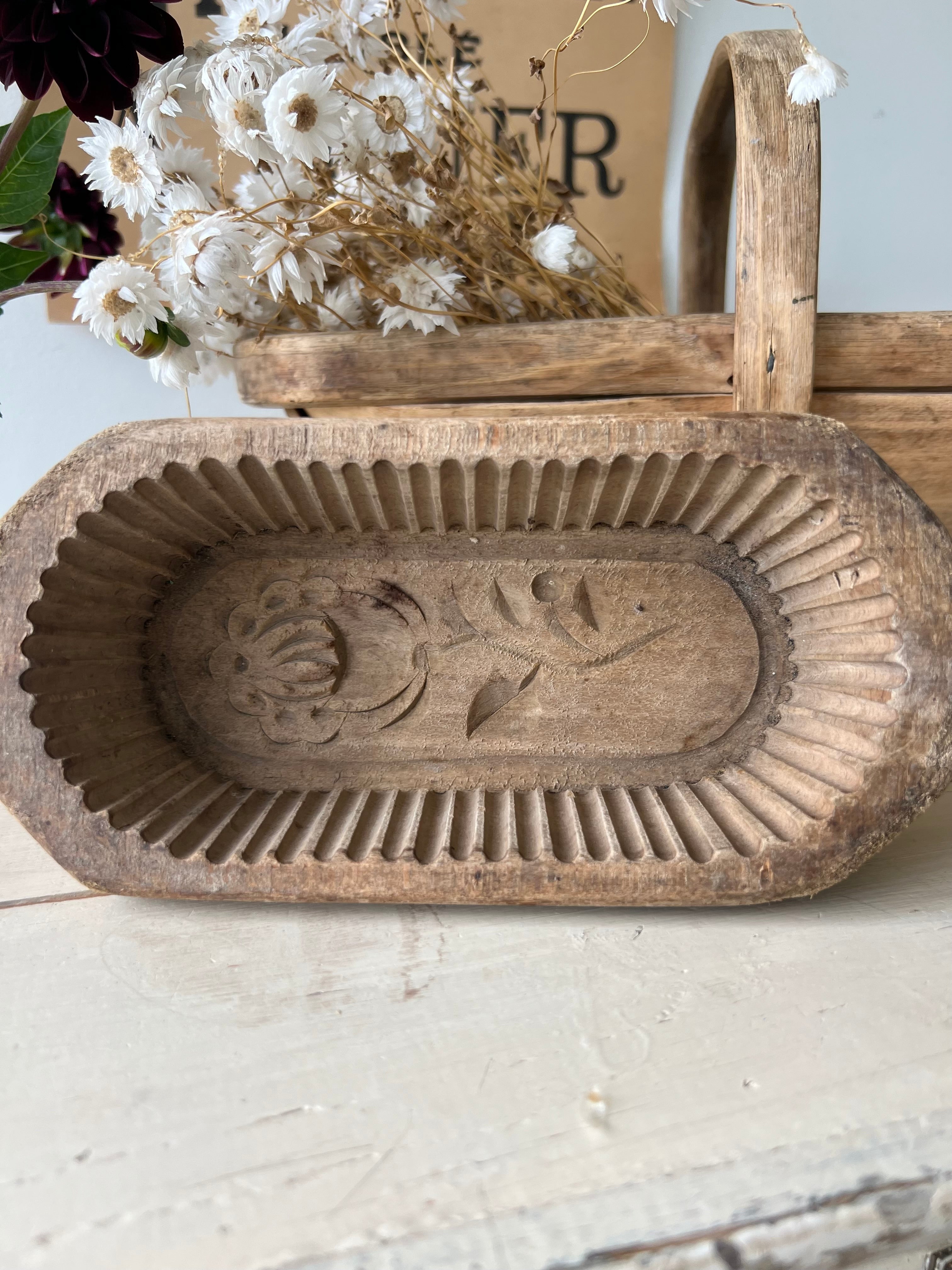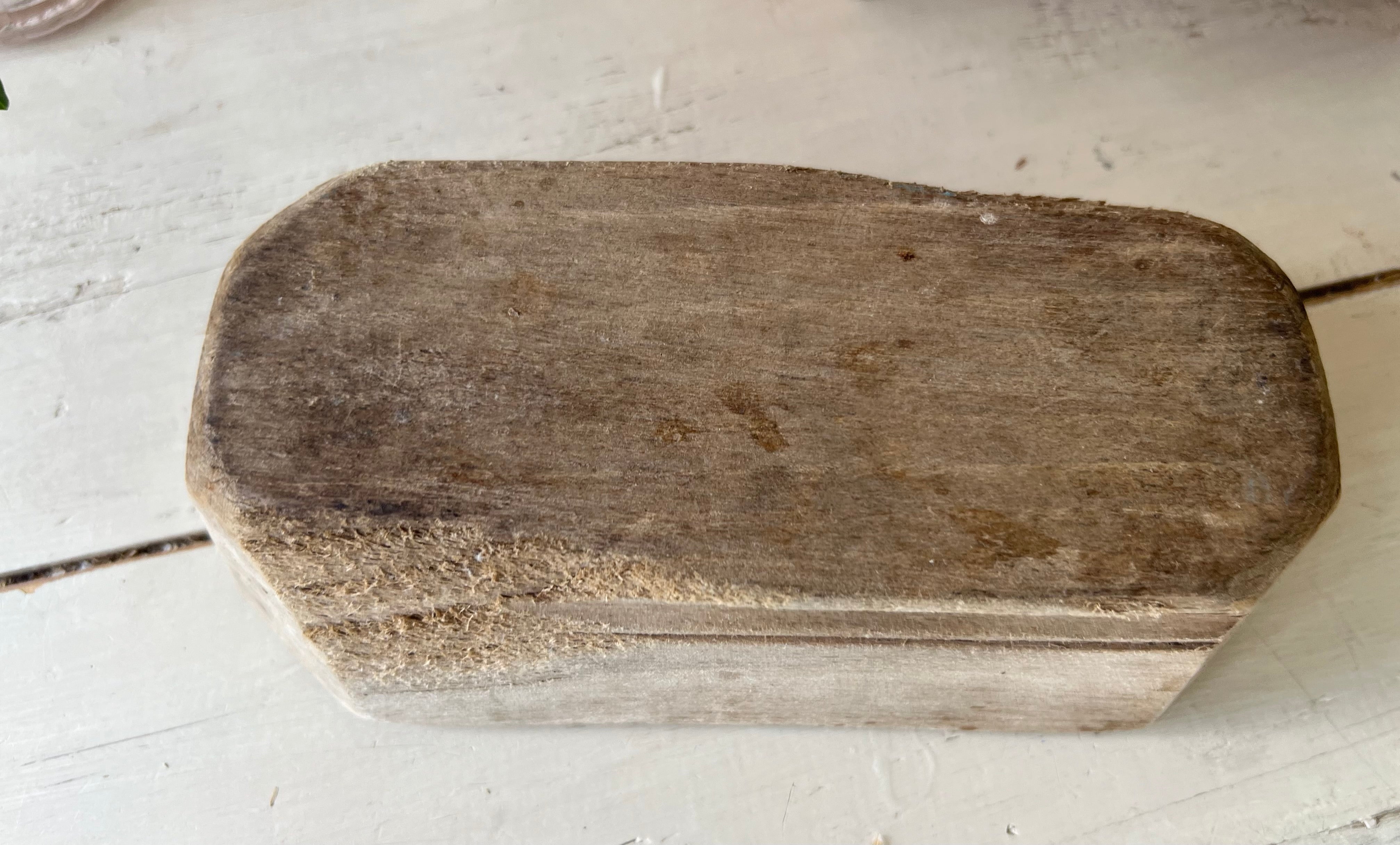 This is simply lovely, a rustic wooden butter mould with a floral design on the inside. A great display piece for a shelf or dresser . There is some ageing to the outside as shown.. but it’s just a sign of use over the years and doesn’t detract from it .