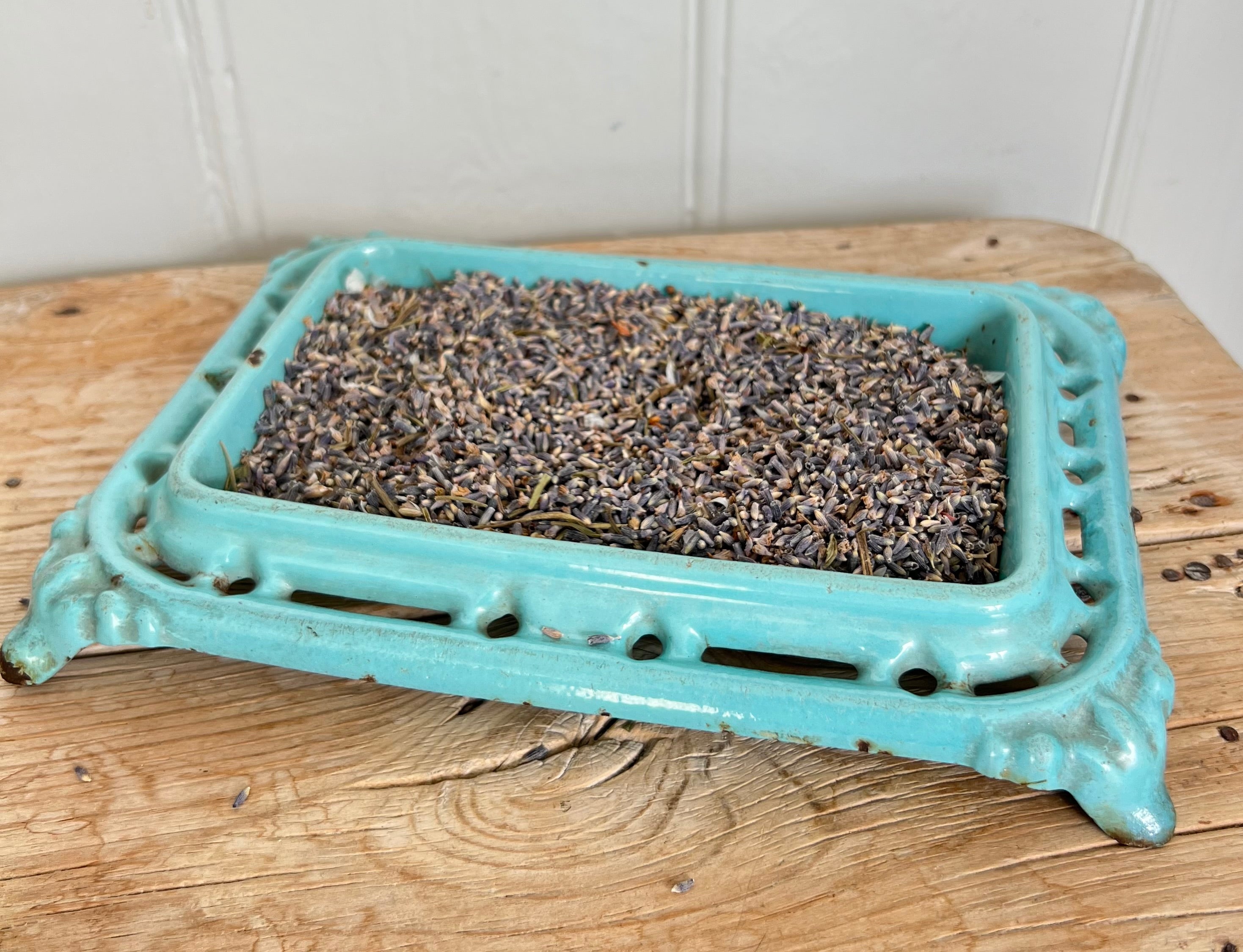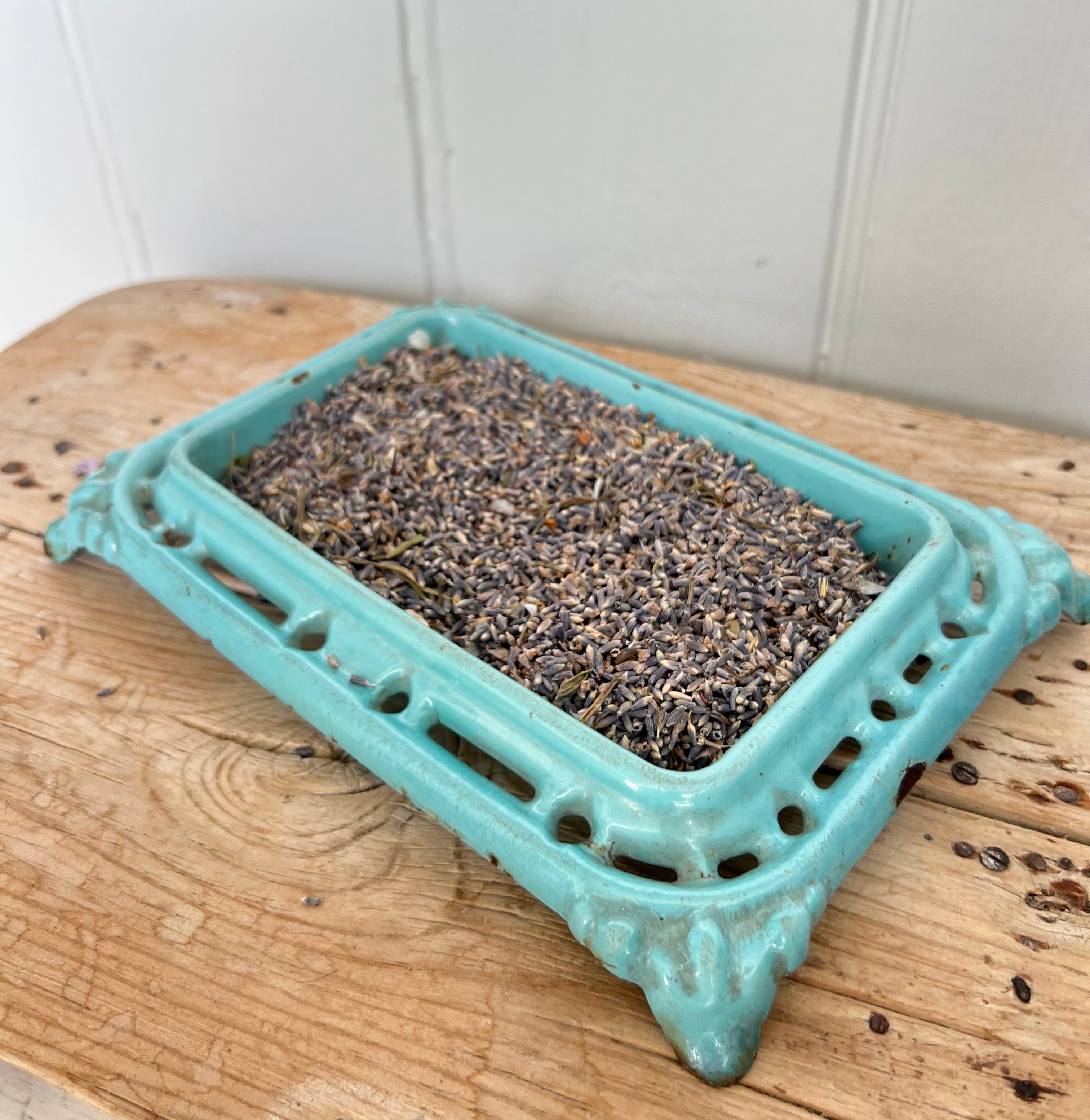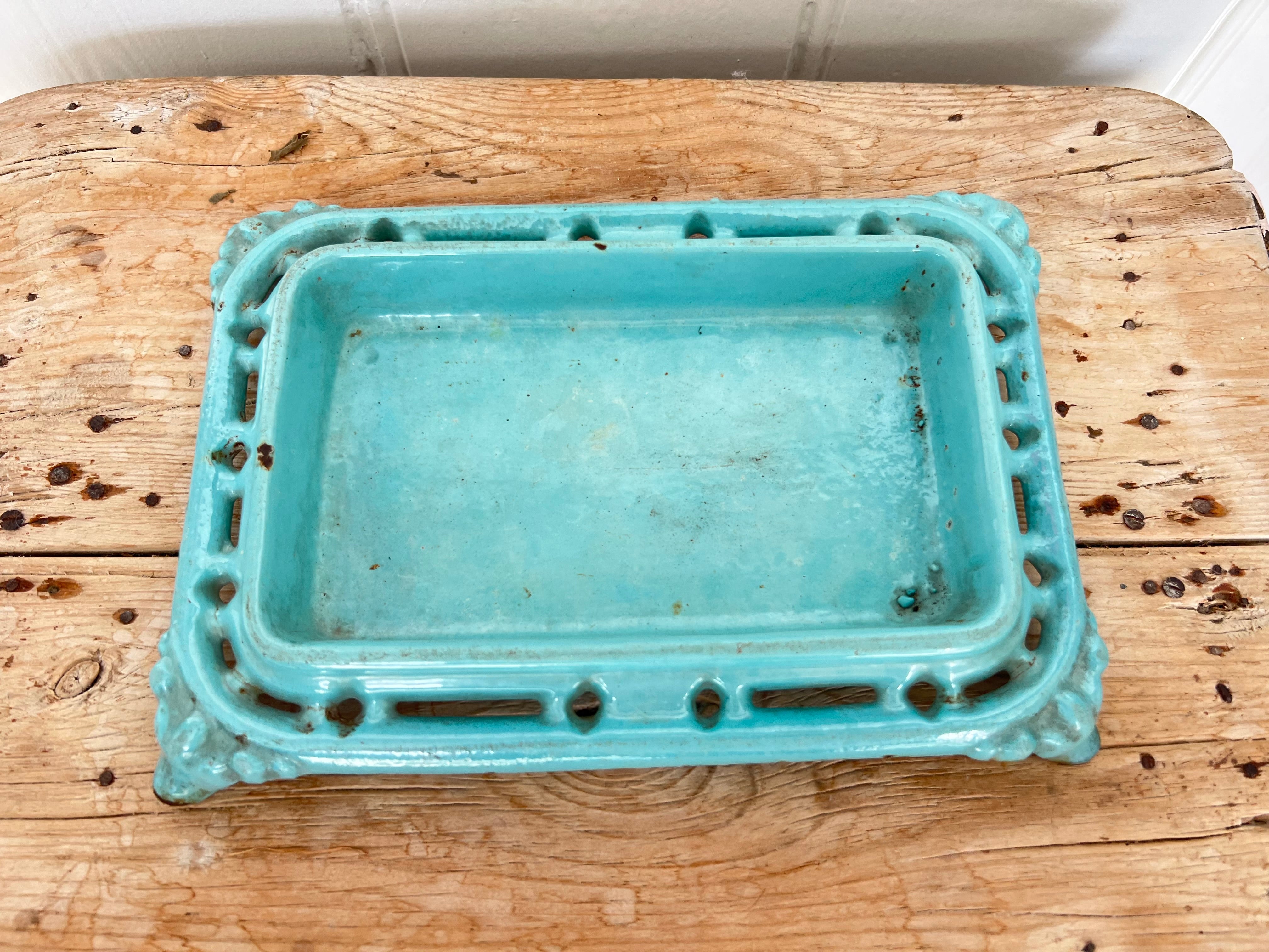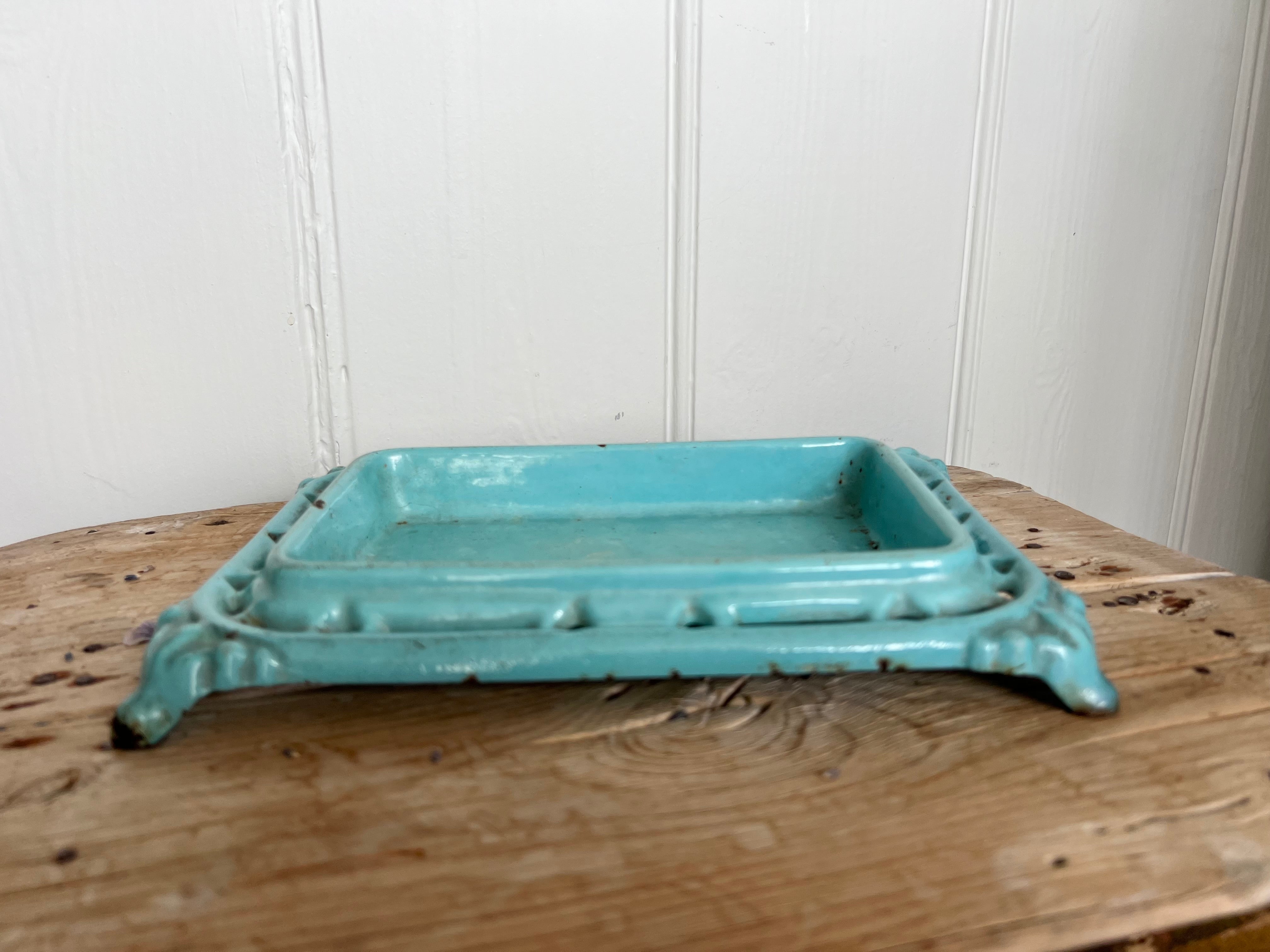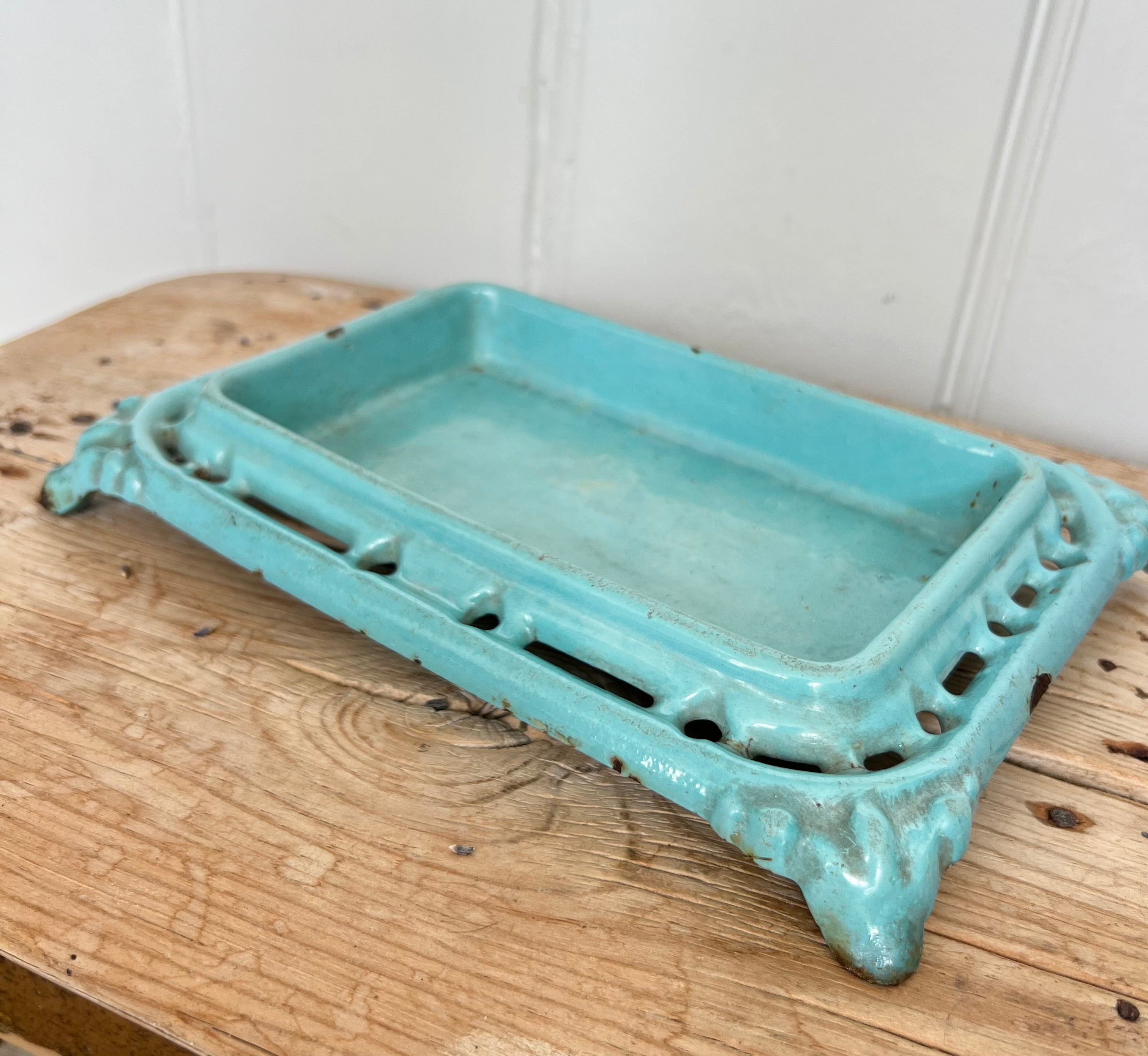 This enamelled cast iron spittoon dates from the bars of 19C France This one is quite an unusual design and the shape is so pretty and the turquoise colour just dreamy. Lovely to fill with dried lavender/ flower heads or use for soaps etc . There is some light wear to the enamel but there are no breaks to the iron . A really gorgeous decorative piece.