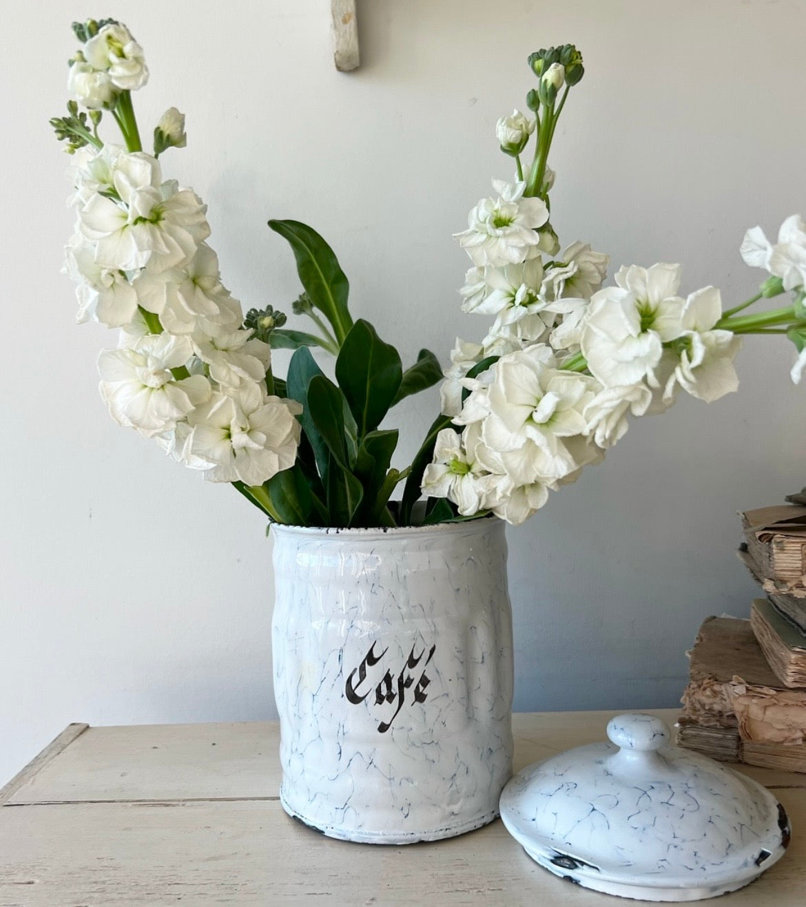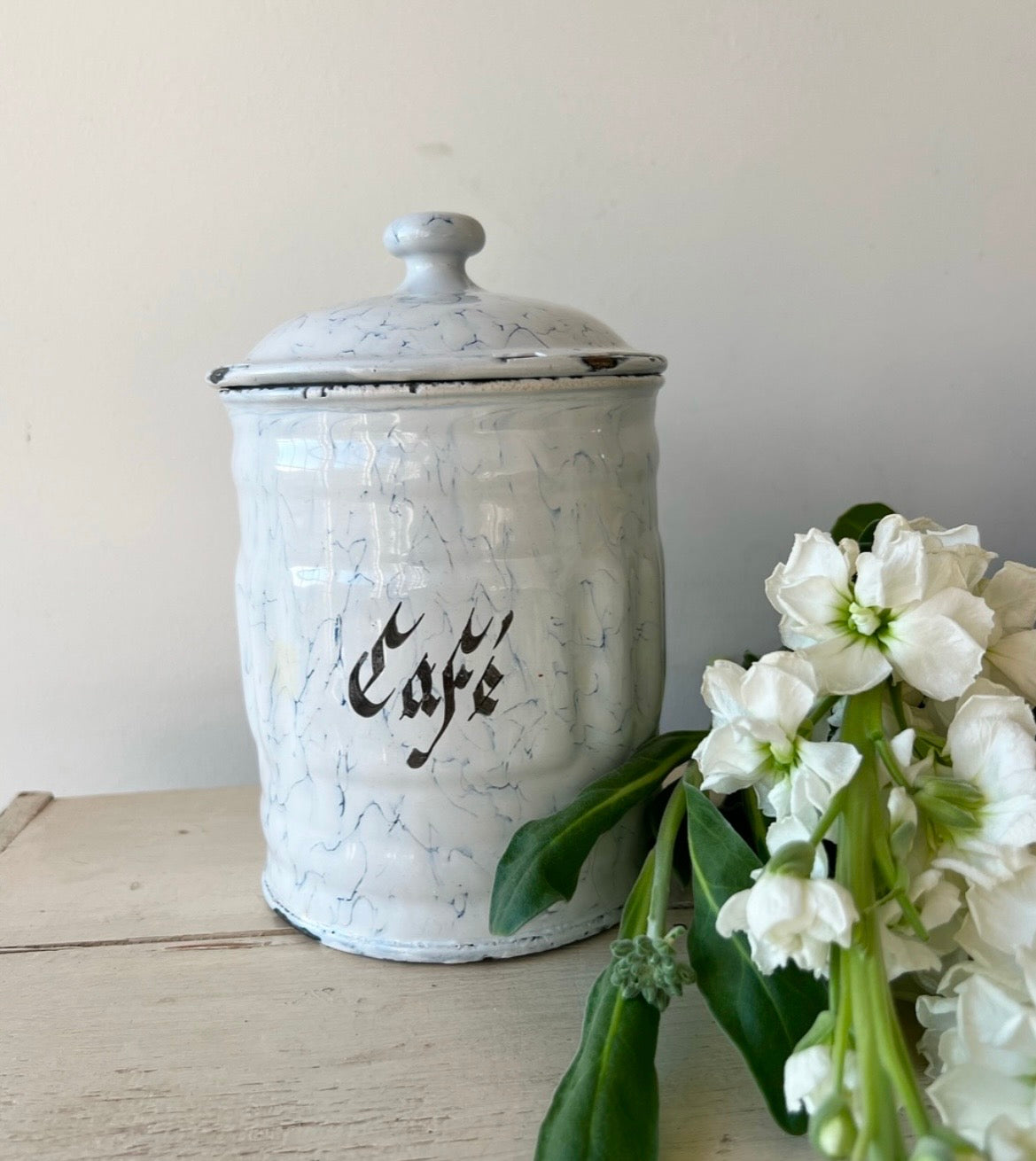 I love the simplicity of this , a lovely blue and white enamel canister that would have held the cafe ( coffee) in a French kitchen. Perfect to display some pretty flowers or a plant , or you could keep your coffee pods inside.