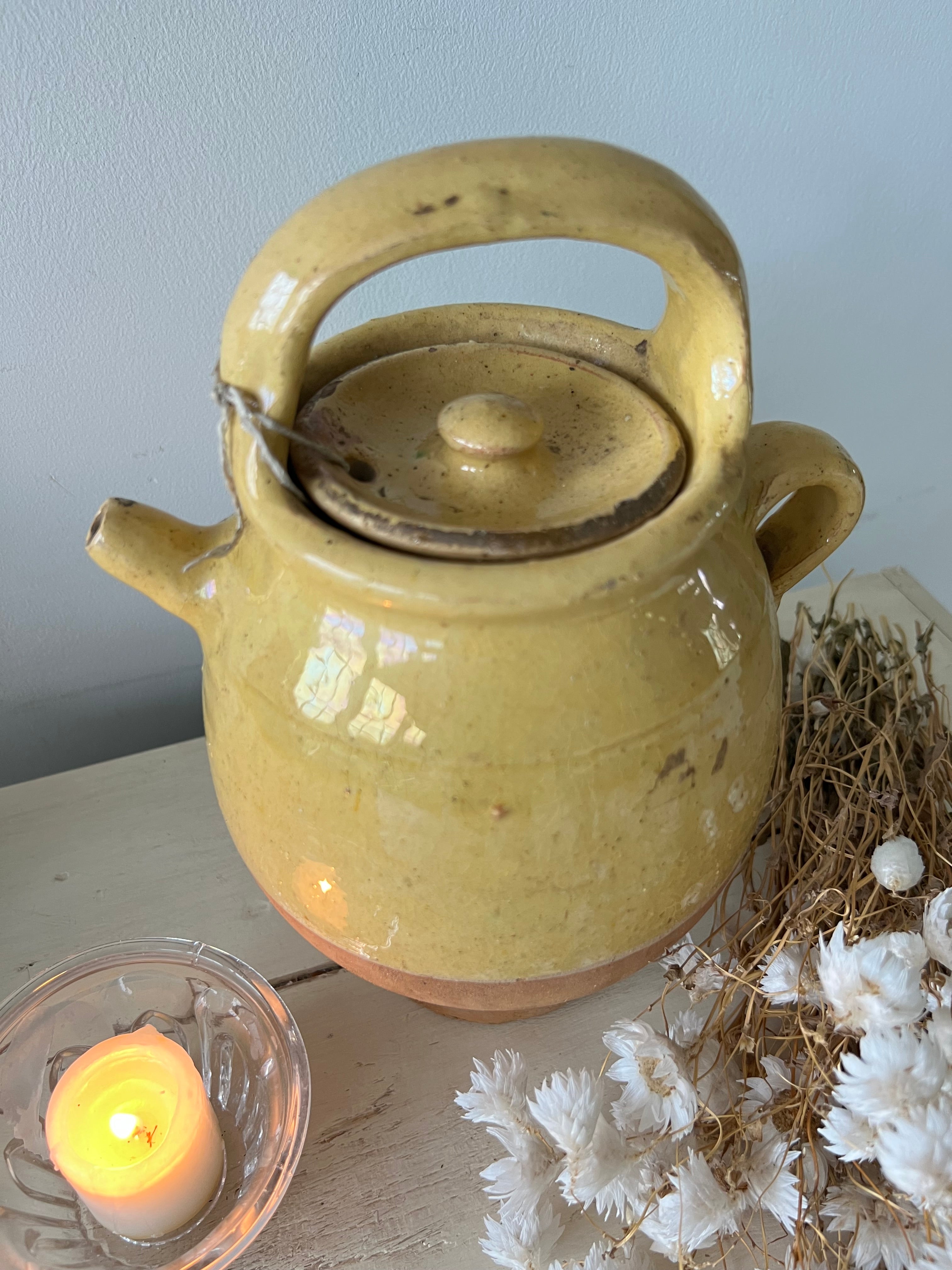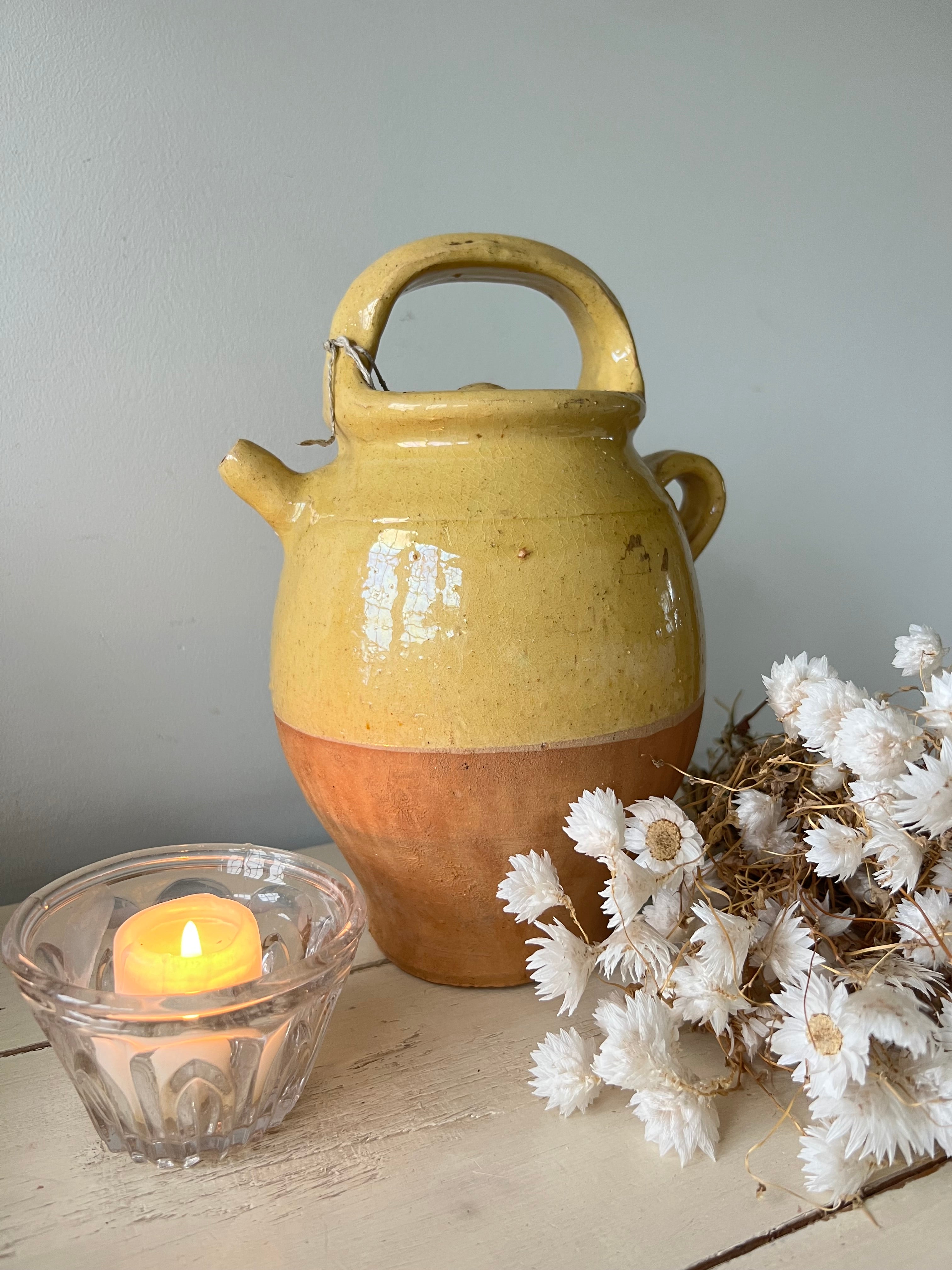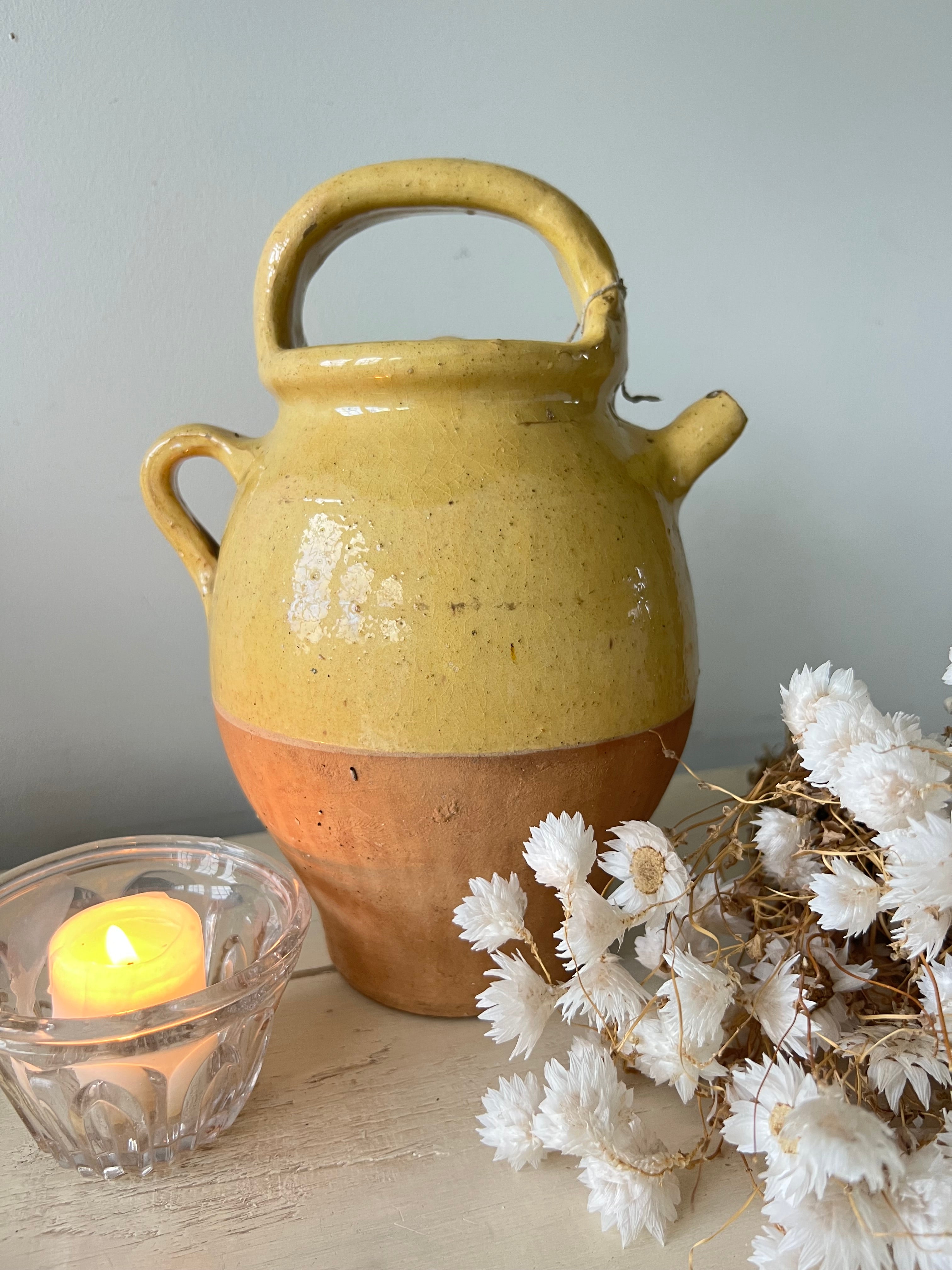 This gargoulette would have been used to carry water, but now is a really decorative piece. The yellow glaze is typical of the South of France and it would look great displayed with some confit pots.. or why not use it to serve water at the table
