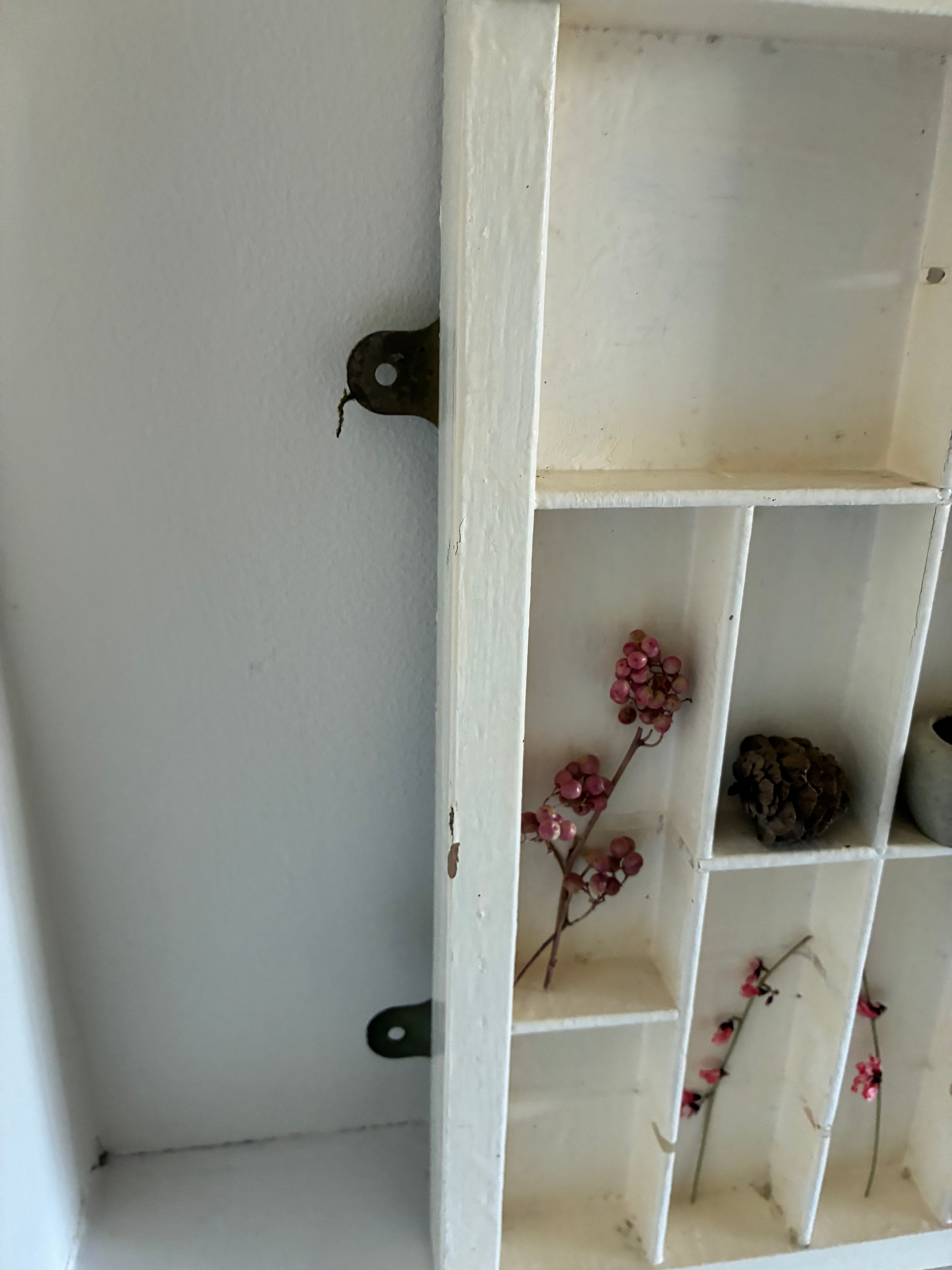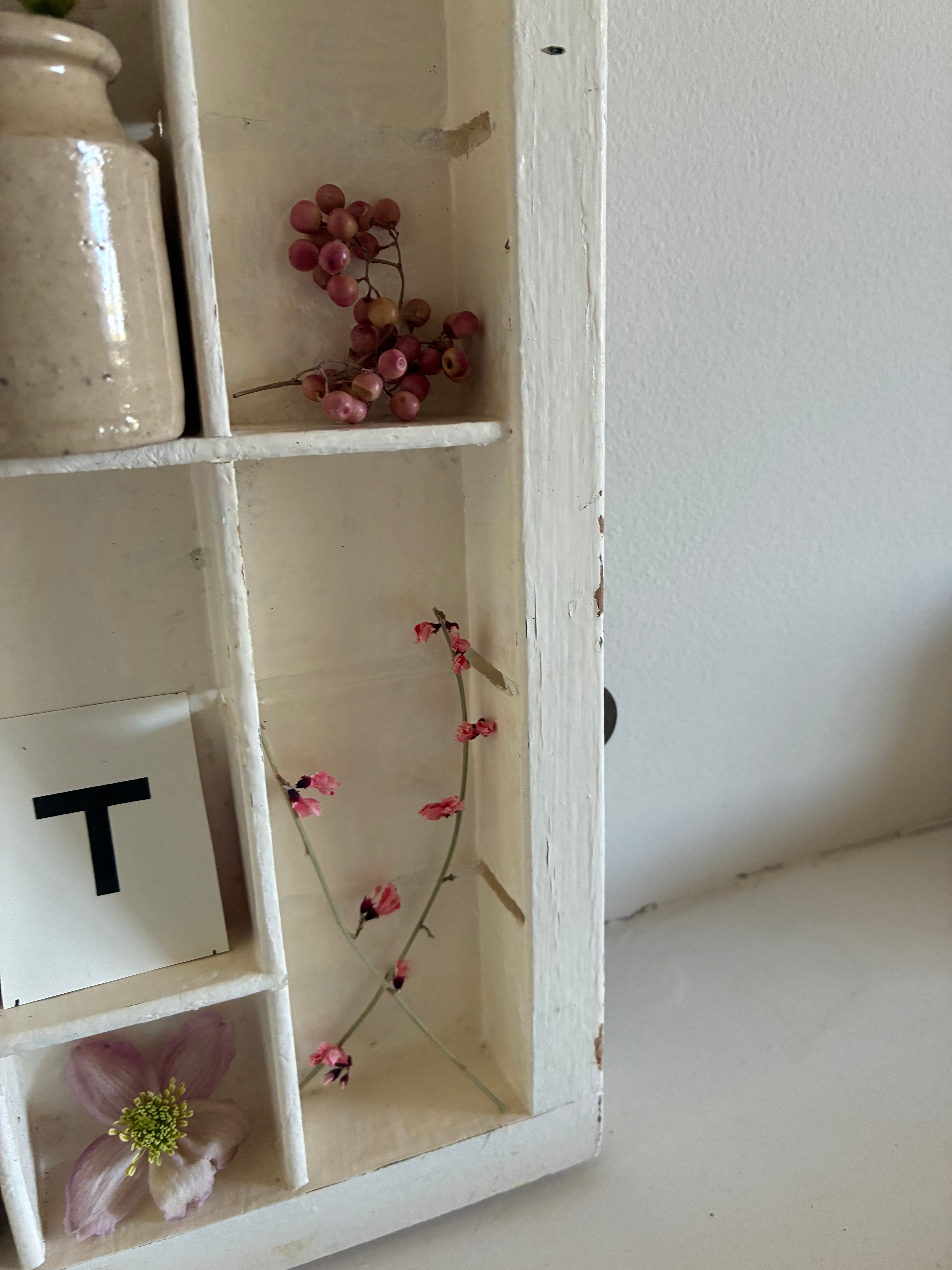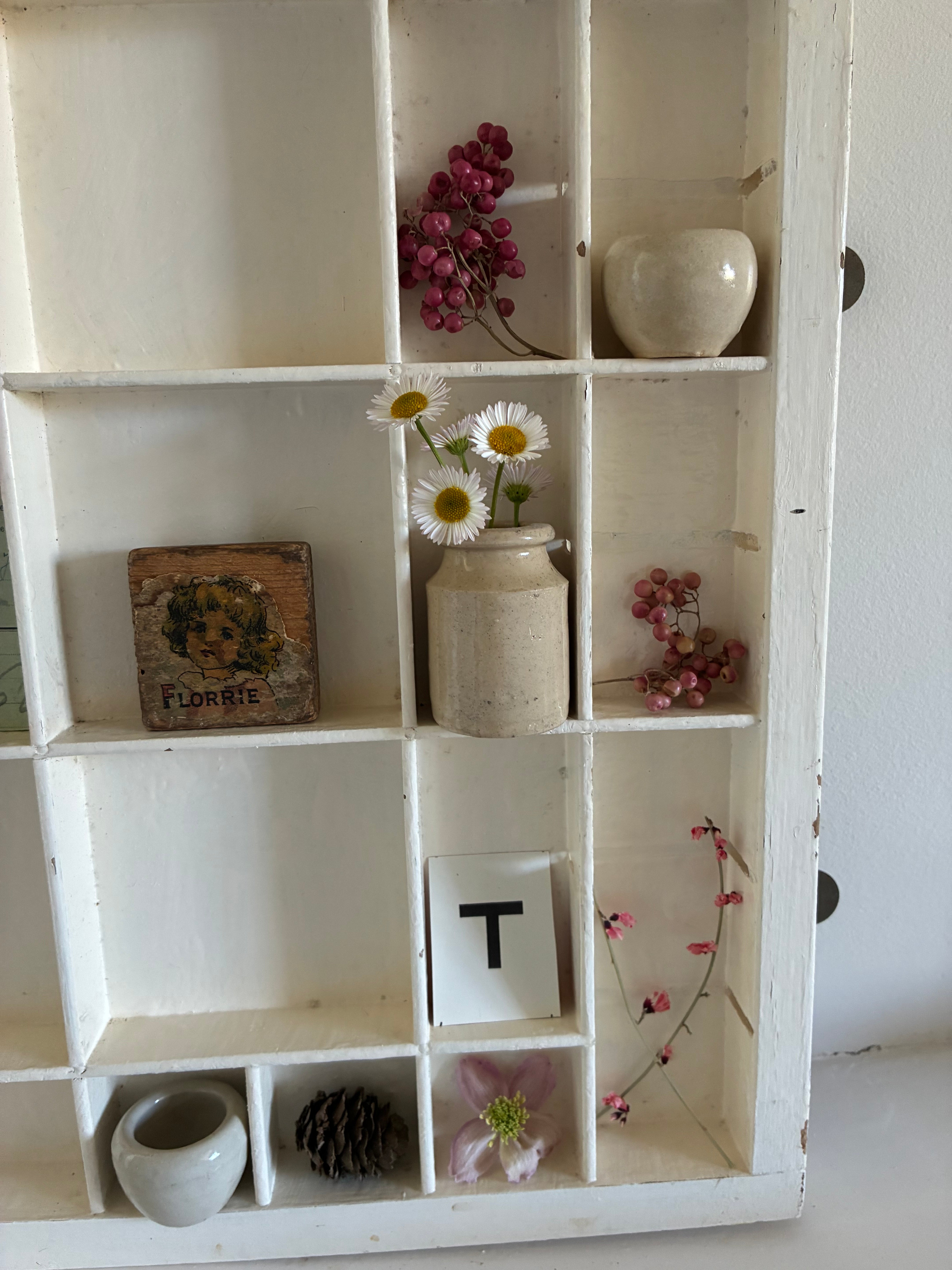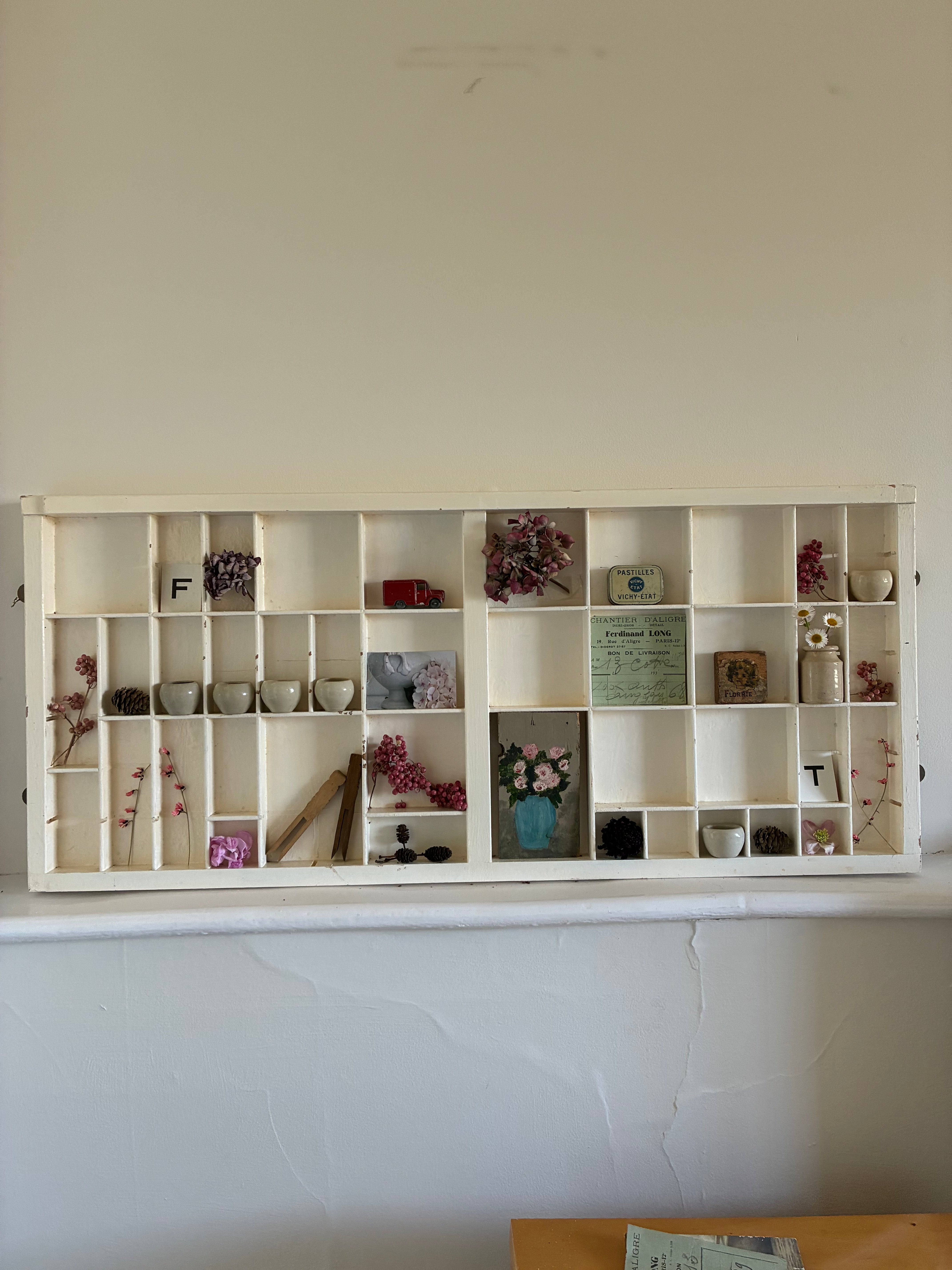 I find printer’’s trays fascinating , it’s such a bygone craft. This one has been painted white at some stage which I love, it really lens itself to a collection of pretty things. There are mirror plates on both ends so it can be wall hung ivor it can be propped on a shelf. A couple of dividing pieces have been removed years ago but it just makes for interesting size spaces… just imagine the fun you can have finding things to fill it.