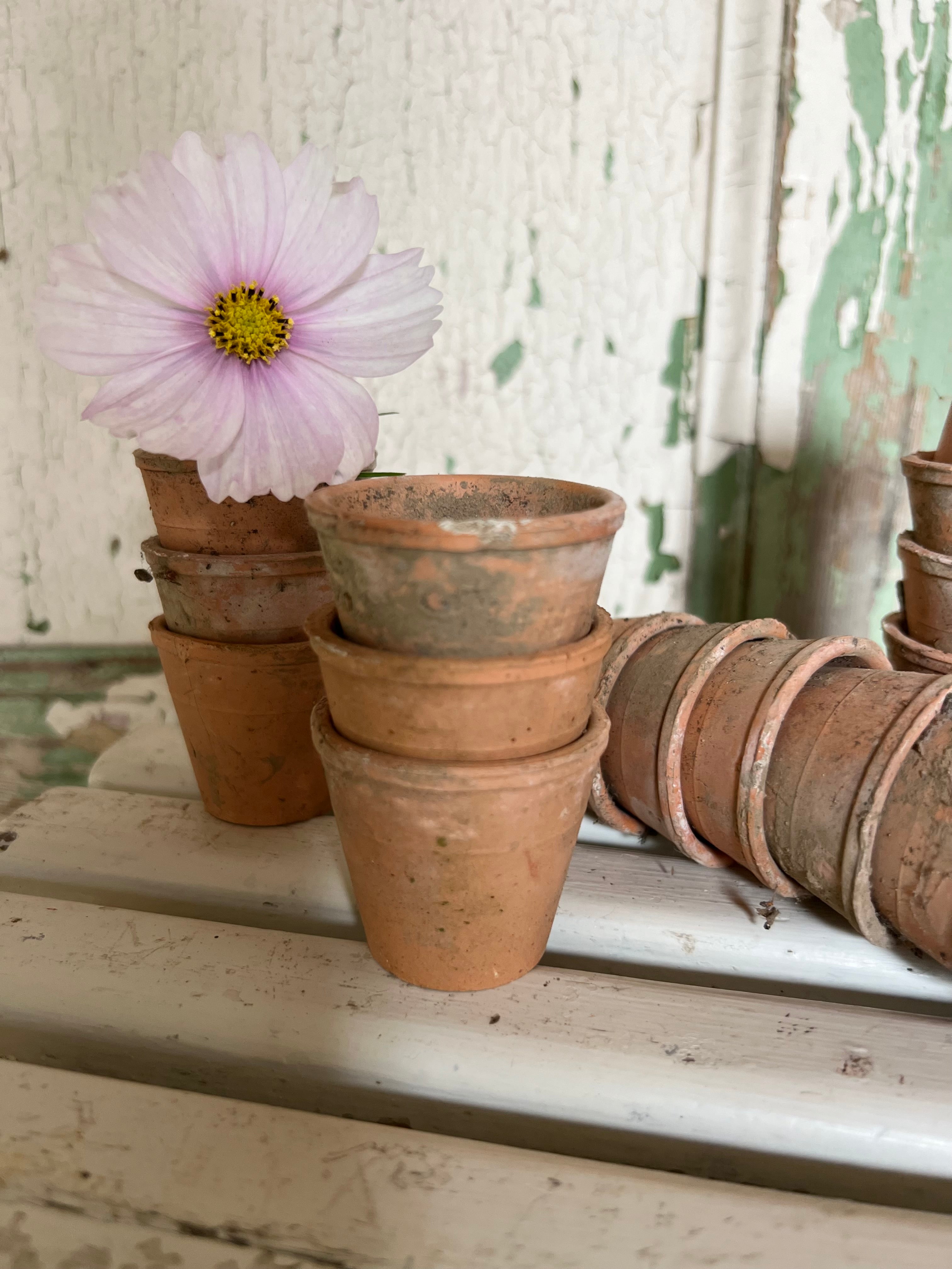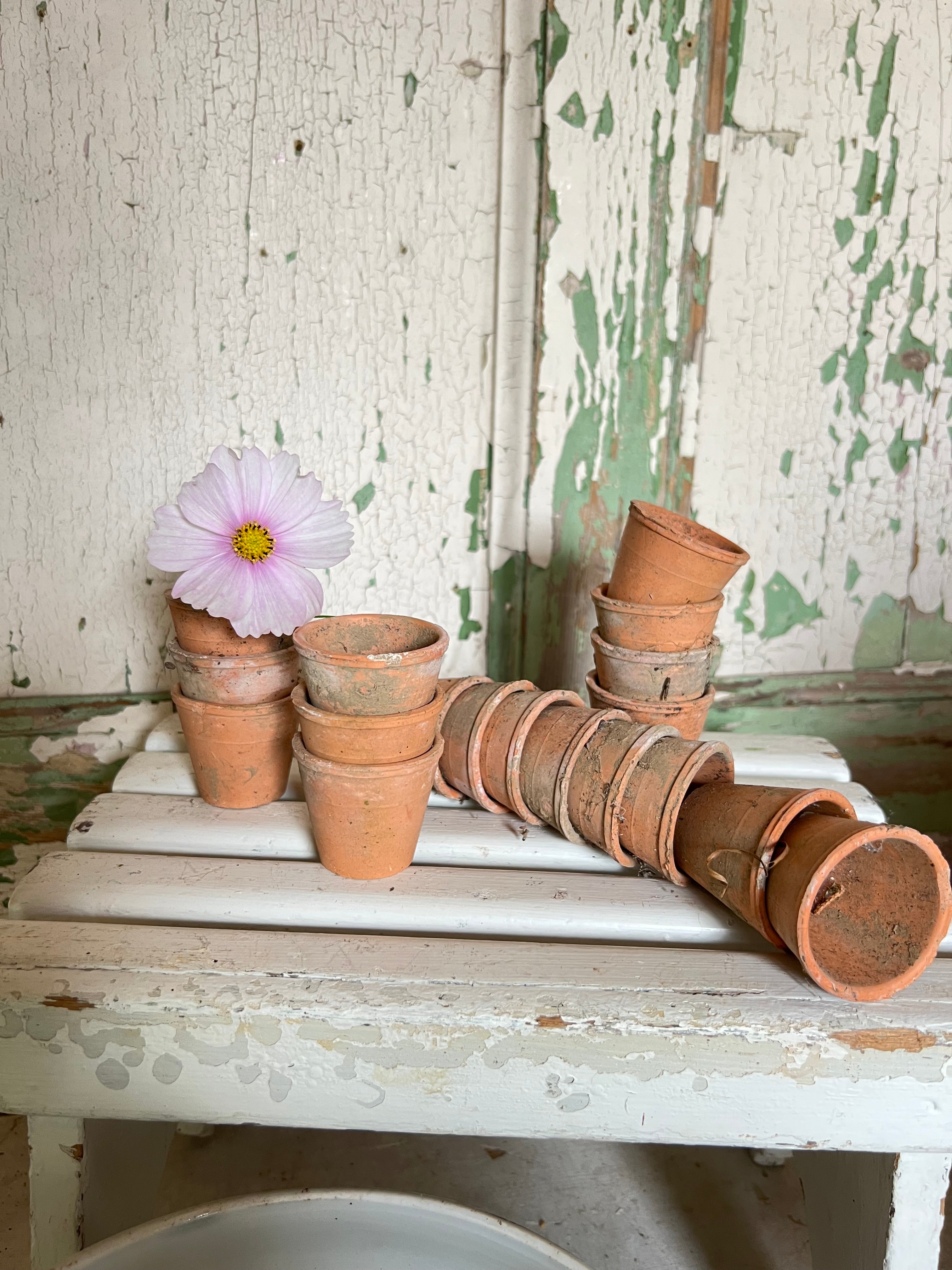 I found a whole box of these in France and had to buy them. They are tiny vintage terracotta pots that were maybe used for individual seeds, but now they look great stacked or lying on a shelf or holding little candles or some small dried flowers.