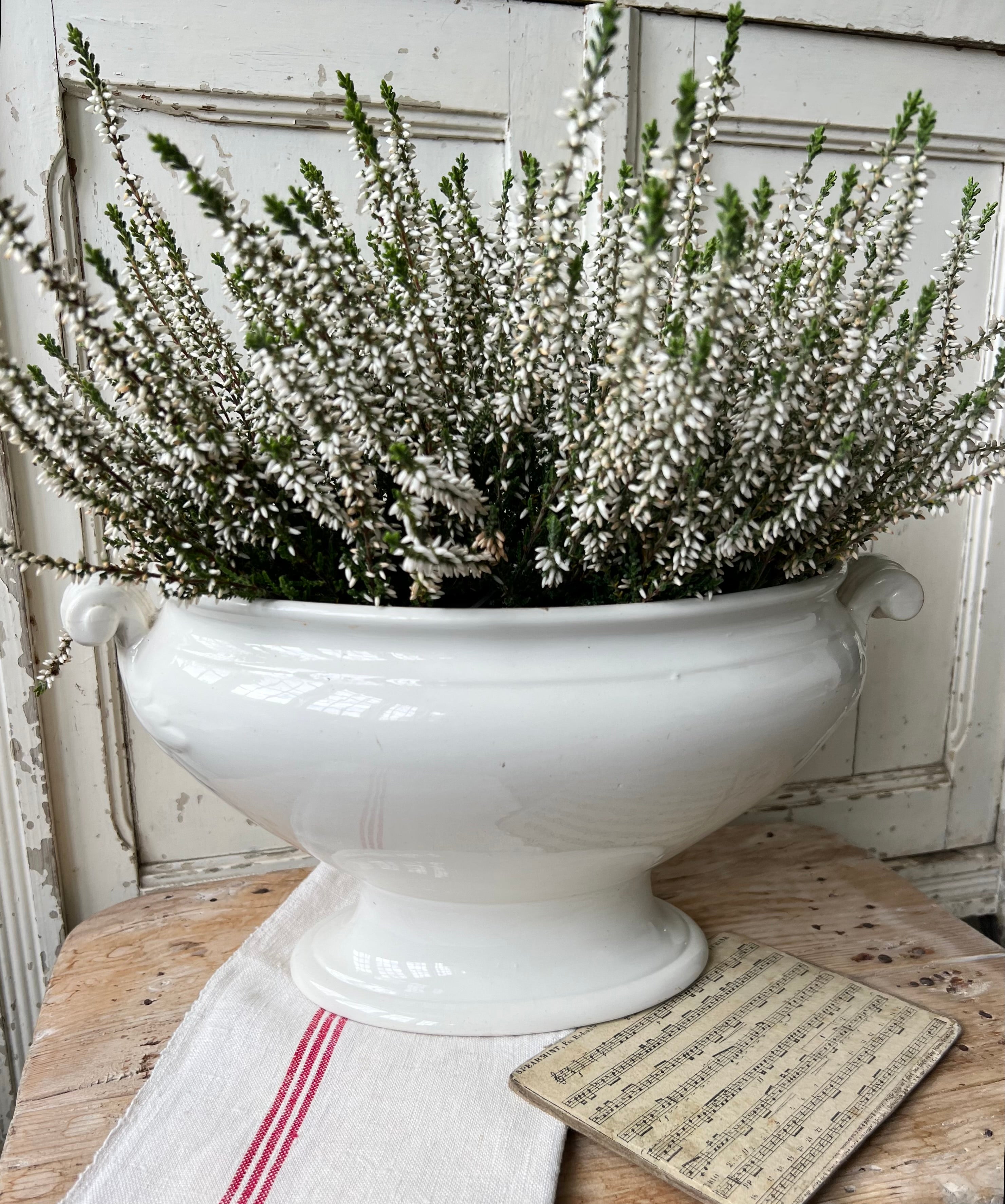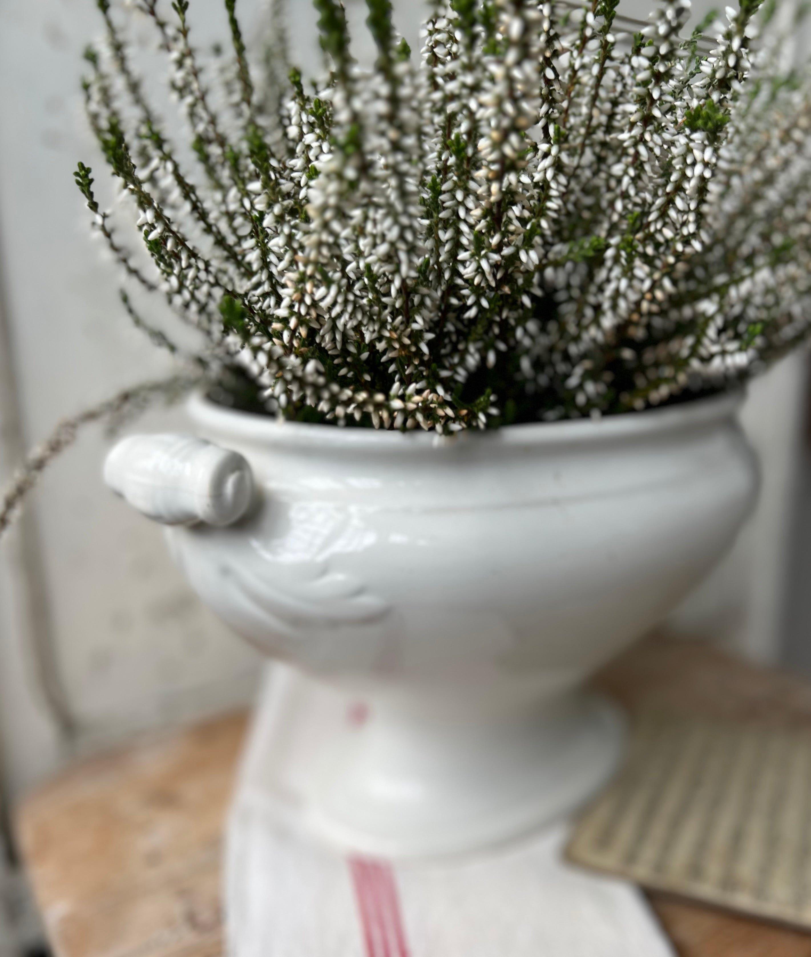 Made by Sarreguimes this oval tureen is elegant and beautiful. It is perfect for planting with bulbs or small plants ( white Viola anyone) and would look great as a table centre, or on a shelf or side table .It would also be great stacked with pine cones .. or Christmas sweets! There is a slight nibble as shown but it definitely doesn’t detract .